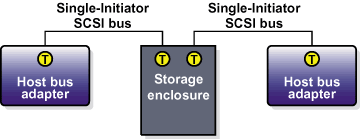 A single-initiator SCSI bus has only one node connected to it, and provides host isolation and better performance than a multi-initiator bus. Single-initiator buses ensure that each node is protected from disruptions due to the workload, initialization, or repair of the other nodes.