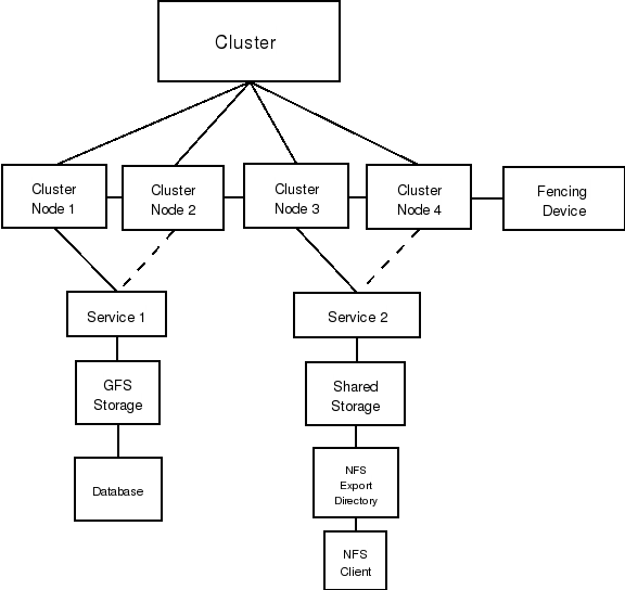Figure 3-2 shows the hierarchical relationship among cluster configuration components. The cluster comprises cluster nodes. The cluster nodes are connected to one or more fencing devices. Nodes can be separated by failover domains to a cluster service. The services comprise managed resources such as NFS exports, IP addresses, and shared GFS partitions. The structure is ultimately reflected in the /etc/cluster/cluster.conf XML structure. The Cluster Configuration Tool provides a convenient way to create and manipulate the /etc/cluster/cluster.conf file.
